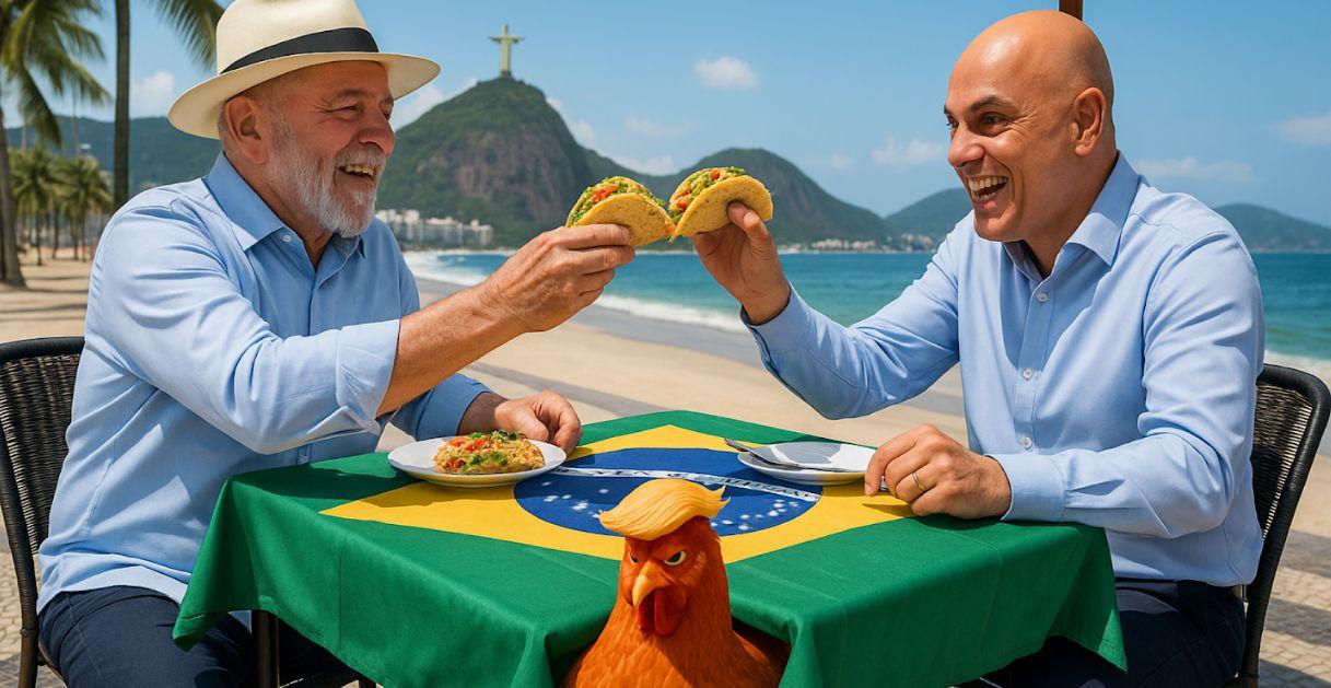 No Brasil, Lula reagiu como sabe: com um jantar. Reuniu o STF no Alvorada pra reforçar apoio institucional, enquanto Moraes avisava que não pretende processar ninguém nos EUA... por enquanto.
