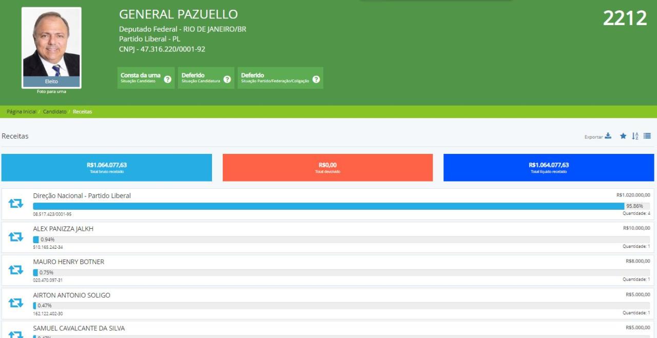 Pazuello recebeu recursos para campanha de R$ 1.064.077,63, dentro de um limite de R$ 3.176.572,53 para gastos. Do montante, ele gastou R$ 944.065,37.