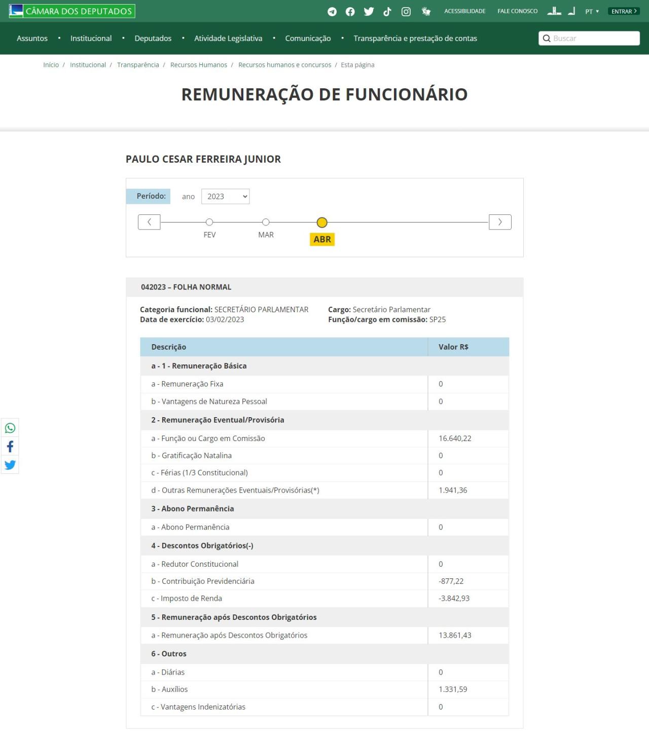 Paulo Cesar Ferreira Júnior é secretário parlamentar de Eduardo Pazuello desde 3 de fevereiro de 2023. A sua remuneração sem descontos no cargo público é de R$ 16.640,22. Com os descontos, ele recebe mensalmente R$ 13.861,43 e um auxílio de R$ 1.331,59.